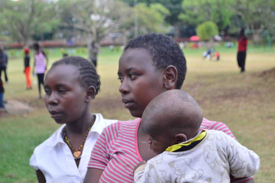 Ann (left) and Joyce (right) as Joyce holds baby Macharia at the #LoveKwaStreets event at Central park.